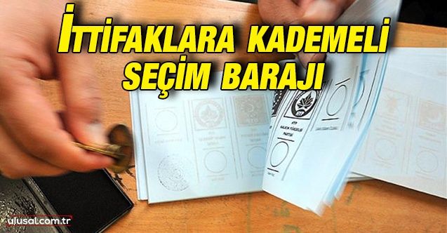 Türkiye gazetesinin haberine göre, AK Parti MHP’den gelen öneri doğrultusunda yeniden çalışmaya başladı. MHP'nin ittifak için barajın yüzde 2 olması teklifine sıcak bakan AK Parti, ittifak yapacak parti sayısına göre barajın belirlenmesine yönelik kademeli bir formülü gündemine aldı.