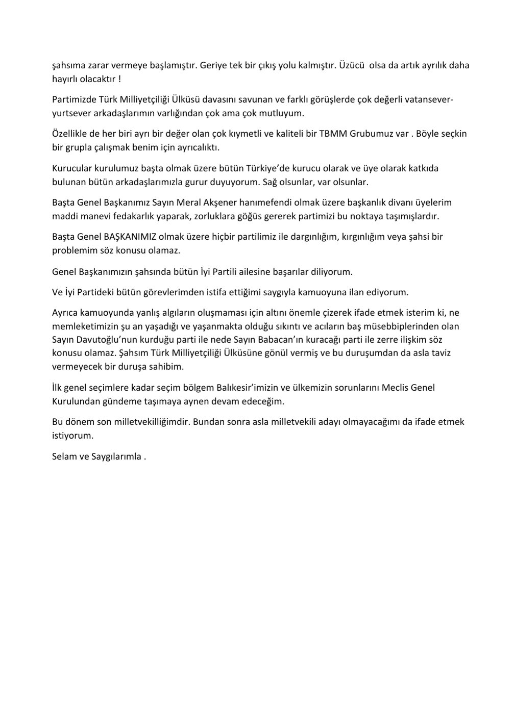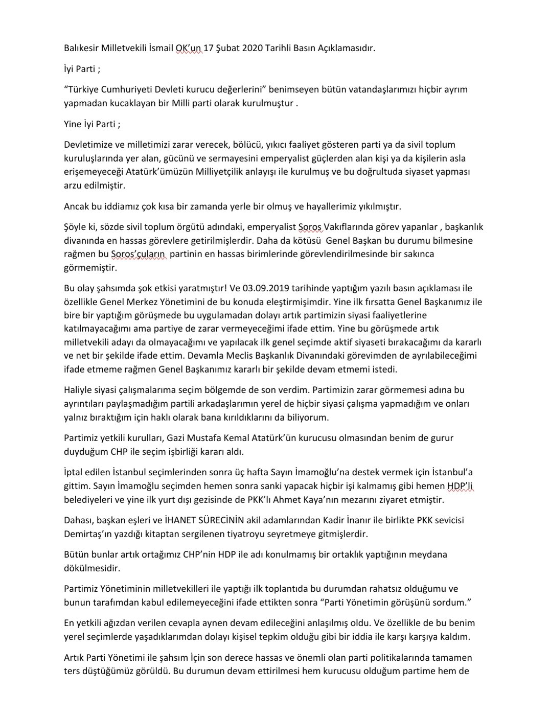 İYİ Parti Balıkesir Milletvekili İsmail Ok, partisindeki tüm görevlerinden istifa ettiğini açıkladı.
