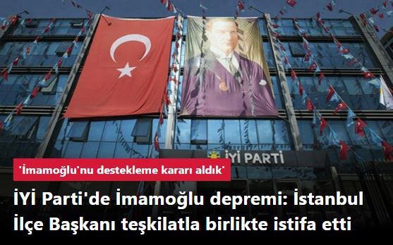 İYİ Parti Sultangazi İlçe Başkanı Sinan Taşkın, sosyal medya hesabından konuya ilişkin açıklamada bulundu. Taşkın, “Maalesef ‘Partimize operasyon yapıyor’ diyenlerin sırf AK Parti kazansın’ diye eski CHP’lilerden medet ummasını doğru bulmuyoruz. Bu kapsamda teşkilat mensubu arkadaşlarla birlikte İmamoğlu’nu destekleme kararı aldık” dedi.