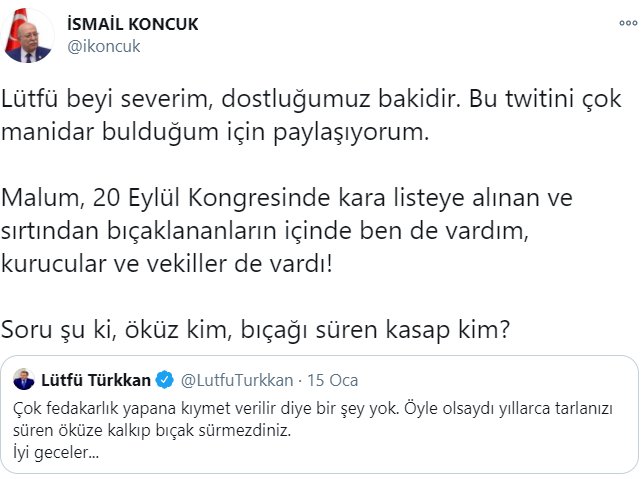 “Lütfü Bey’i severim, dostluğumuz bakidir. Bu twitini çok manidar bulduğum için paylaşıyorum. Malum, 20 Eylül Kongresinde kara listeye alınan ve sırtından bıçaklananların içinde ben de vardım, kurucular ve vekiller de vardı! Soru şu ki, öküz kim, bıçağı süren kasap kim?