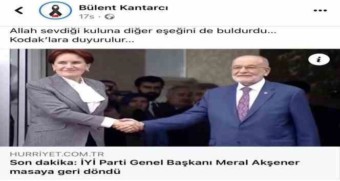 CHP'lı Çaycuma Belediye Başkanı Bülent Kantarcı, Çaycumaspor için önceki günlerde yaptığı paylaşımda "Allah sevdiği kuluna eşeğini kaybettirir sonra da buldururmuş" benzetmesi yaptı. Çaycumaspor ile ilgili tartışmalar devam ederken Kantarcı bu kez de aynı benzetmeyi 6'lı masadan kalktıktan bir süre sonra geri dönen Meral Akşener için de yaptı. Kantarcı, "Allah sevdiği kuluna diğer eşeğini de buldurur" paylaşımının ardından bazı İYİ Parti üyeleri duruma tepki gösterdi.