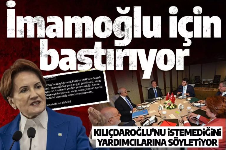Adaylık için ön plana çıkan tek isim CHP lideri Kemal Kılıçdaroğlu ancak İYİ Parti lideri Meral Akşener'in gönlünde farklı bir isim yatıyor. Siyasi yasak ve hapis kararı sonrası Akşener, Ekrem İmamoğlu'nda ısrarcı. Hatırlanacağı gibi Kemal Kılıçdaroğlu'nun adaylığına açıkça karşı çıkan Meral Akşener, Ekrem İmamoğlu'nu parlatmak için Saraçhane'ye gitmişti.