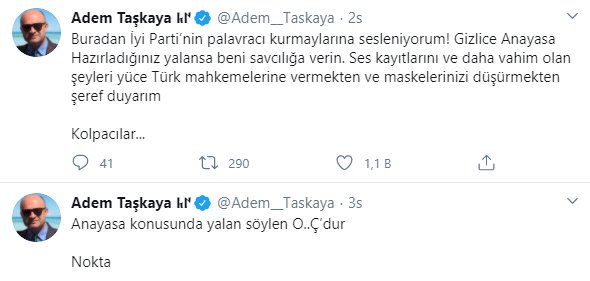 "Buradan İyi Parti’nin palavracı kurmaylarına sesleniyorum! Gizlice Anayasa Hazırladığınız yalansa beni savcılığa verin. Ses kayıtlarını ve daha vahim olan şeyleri yüce Türk mahkemelerine vermekten ve maskelerinizi düşürmekten şeref duyarım Kolpacılar..."