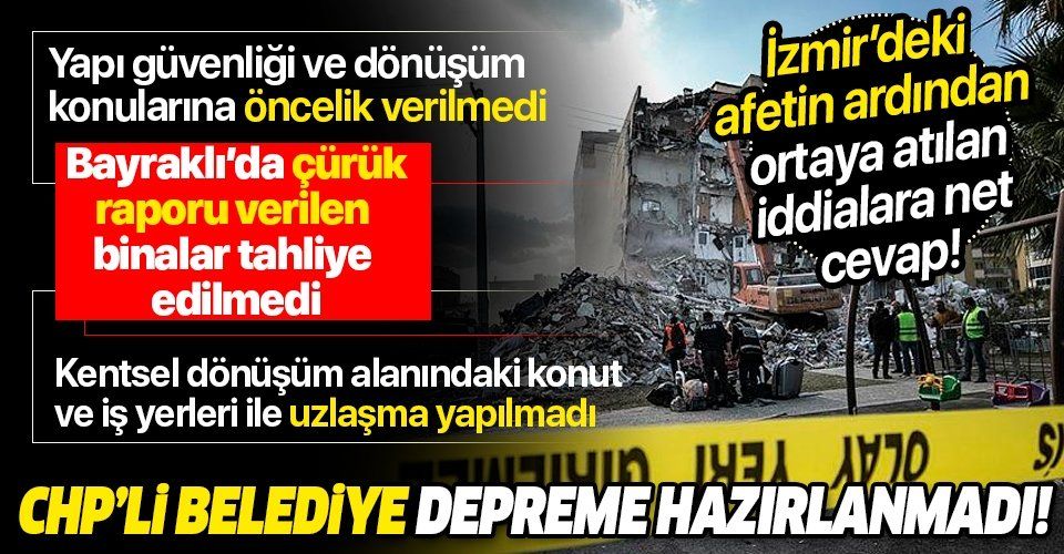 İzmir Büyükşehir Belediyesi'nin; İzmir'in deprem kuşağında yer almasına rağmen, yerel yönetim planları arasında yapı güvenliği ve dönüşüm konularına öncelik vermediği bildirildi. İzmir Büyükşehir Belediyesi'nin 2012 yılında Bakanlar Kurulu'ndan kentsel dönüşüm onayı alarak, kentsel dönüşümü kendi bünyesinde gerçekleştirmek istediği öğrenildi. Doğanlar ile Rıza bey apartmanlarına Bayraklı Belediyesi'nin Deprem Etüt Merkezi tarafından bina sakinlerinin talebi üzerine yapılan inceleme ile hazırlanan 2012 ve 2018'de 'çürük' raporu verildiği, her iki binanın da riskli ve tehlikeli olduğu belirtilerek ev sahipleri uyarılmasına rağmen Bayraklı Belediyesi tarafından tahliye edilmediği öğrenildi. Doğal afetlere daima hazırlıklı olduklarını iddia eden Tunç Soyer'in yönettiği İzmir Büyükşehir Belediyesi'nin hizmet binasının depreme dayanaksız olduğu, yeterli güçlendirmelerin yapılmadığı bildirildi. İzmir Büyükşehir Belediyesi 1/25000'lik imar planlarını yaptı mı? İzmir Büyükşehir Belediyesi tarafından 1/25000'lik imar planları yapılmadı. Hükümetin İzmir için yaptığı 1/100000'lik imar planlarını dava etti mi? Çevre ve Şehircilik Bakanlığı, 16 Kasım 2015 tarihinde İzmir 1/100.000'lik Çevre Düzeni Planı'nı onayladı. Şehir Plancıları Odası İzmir Şube Başkanı Özlem Şenyol; "Biz daha önce yapılan planlarla ilgili Danıştay'a yürütmeyi durdurma davası açtık" ifadelerini kullandı. 20192024 Stratejik Planında toplam 8 bin 29 konut/işyeri kentsel dönüşüm alanında uzlaşmanın tamamlanması hedefleniyor. Yani riskli yapıların kentsel dönüşümüne başlanmadığı gibi henüz ulaşmaya dair bir adım dahi atılmadı. İzmir Büyükşehir Belediyesi'nin kentsel dönüşümdeki mevcut durumu nedir? İzmir Büyükşehir Belediyesi 2012 yılında Bakanlar Kurulu'ndan kentsel dönüşüm onayı alarak, kentsel dönüşümü kendi bünyesinde gerçekleştirmek istedi. 35 bin konut dönüşümü planlandı ancak sadece bin tanesi gerçekleşti. 5 bin civarı ihale aşamasında. 20192024 planlamasının tamamının gerçekleşmesi ise 30 yıldan uzun bir süreye tekabül ediyor. Kentsel dönüşüm ve sağlıklı yapılaşma faaliyetlerini yürütmek hedefi toplam 36.946.000,00 TL öngörüsüyle bütçe içinde yüzde 1.81 oranında yer alıyor. Yerinde ve uzlaşmaya dayalı kentsel dönüşüm hizmetlerinin yürütülmesi ise yüzde 0.07'lik oranla bütçe içinde yer alıyor. İzmir Büyükşehir Belediyesi, depremle mücadele ve kentsel dönüşüme yıllık ne kadar bütçe ayırdı? 2020 yılı Mali Bütçesinde; Kentsel Dönüşüm Daire Başkanlığı için 27.122.000,00 TL bütçe ödeneği öngörüldü. İzmir Büyükşehir Belediyesi, 2020 yılı bütçesi 7.950.000.000,00TL olup, gayrimenkul ve kamulaştırma bunun yaklaşık 0,075'ine denk geliyor. Yani binde bir bile değil. İmar Barışı kentsel dönüşüme engel mi? Arsa tapusu olduğu için kentsel dönüşüme girmek istemeyen yapı sahipleri ile tapusuz gecekondu kentsel dönüşüm için pek çok bölgede projelerin ilerlemesini engelliyordu. Şimdi çıkarılan yeni hakla beraber bu tip evler için yapı kayıt belgesi düzenlenecek. Bu belge ile beraber söz konusu taşınmazlar kentsel dönüşüm başvuru formu doldurmaya hak kazanacak. İzmir Büyükşehir Belediyesi'nin ana hizmet binası depreme dayanıklı mı? Bina hakkında depreme dayanıksız olduğuna ilişkin rapor var mıdır? Bina çalışmaya uygun mu yoksa tahliye mi edildi? Depreme dayanıksız olduğuna dair rapora rağmen İzmir Büyükşehir Belediyesi tarafından yıllardır 'yeterli güçlendirilmenin yapılmadığı Büyükşehir Belediye binası depremde hasar gördü. Sıva çatlağı ve alçı dökülmeleri oluşan bina, kullanıma kapatıldı. Deprem vergileri ne oldu, nereye harcandı? Marmara Depremi 201.9 milyar TL Düzce Depremi için 3.75 milyar TL Bingöl Depremi için 4.21 milyar TL Elazığ Depremi için 3.92 milyar TL Kütahya Depremi için 5.07 milyar TL Van Depremi için 13.8 milyar TL Depreme yönelik sağlık yatırımları için 20032019 arasında toplam 105.5 milyar TL, kentsel dönüşüm için 112.4 milyar TL, depreme yönelik ulaştırma harcamaları için 488.4 milyar TL, acil yardım yatırımları için 11.5 milyar TL, toplamda ise 1.21 trilyon TL yatırım harcaması yapıldı. Çevre ve Şehircilik Bakanlığı depremde hasar gören binaları yenileyecek mi? TOKİ, kalıcı konutların yapımı için AFAD'la koordinasyon halinde hem yerinde hem de rezerv alanlarda süreci başlattı. Çevre ve Şehircilik Bakanlığı depremde evi hasar görenlere yardımda bulanacak mı? Yıkılan veya yıkılma riski bulunan ağır hasarlı binalara ilişkin bütün vatandaşlarımıza kira yardımı yapılacak. 30 bin TL eşya yardımı, ev sahiplerine 13 bin lira, kiracılara da evlerinde oturamayacaklarsa 5 bin lira taşınma ve kira yardımı verilecek.