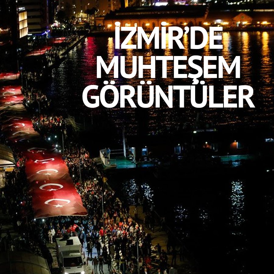 Yürüyüşte 350 metre uzunluğunda Türk bayrağı açıldı. Marşlar eşliğinde yürüyen binlerce İzmirliye çevredeki vatandaşlar da alkışlarıyla destek verdi.