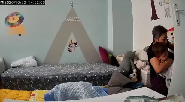 Çocuğuyla birlikte deprem sona erdikten sonra odadan dışarıya doğru yöneliyor.