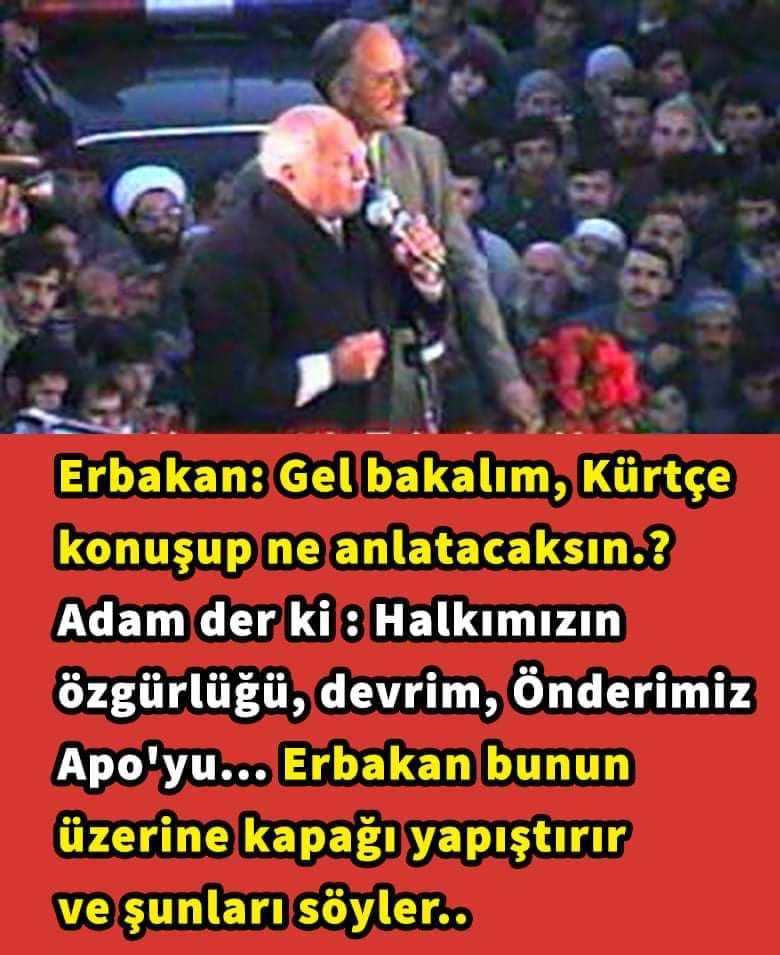 Gel bakalım, Kürtçe konuşup ne anlatacaksın.? Der ki : Halkımızın özgürlüğü, devrim, Önderimiz Apo.. Erbakan tamam, yeterli der. Sen değil Kürtçe, Türkçe de konuşsan gafilsin, zarardasın. Ve döner yanındaki Kürt korumasına sorar; sen anlat bakalım, Kürtçe konuşsan bu millete ne anlatırsın? Koruma cevap verir : Al’lah, Pey’gamber, İ’ttihad, Ad’alet, Ah’lâk.. Erbakan tamam der, sen değil Kürtçe ve Türkçe, İbranice de konuşsan başımın tacısınErbakan hocanın bu anısından anlayacağımız üzere insanın konuştuğu dil veya ırk hiçbir şeyi fark etmiyor. Önemli olan burada insanın yönelmiş olduğu taraftır. Bu yazımızda asla hiçbir dil veya ırka mensup kişilere hakaret amaçlı bir içerik yoktur. Sadece Necmettin Erbakan’ın bu hikayesi oldukça hoşumuza gitmiş ve sizinle paylaşmak istedikErbakan hocanın bu anısından anlayacağımız üzere insanın konuştuğu dil veya ırk hiçbir şeyi fark etmiyor. Önemli olan burada insanın yönelmiş olduğu taraftır. Bu yazımızda asla hiçbir dil veya ırka mensup kişilere hakaret amaçlı bir içerik yoktur. Sadece Necmettin Erbakan’ın bu hikayesi oldukça hoşumuza gitmiş ve sizinle paylaşmak istedik