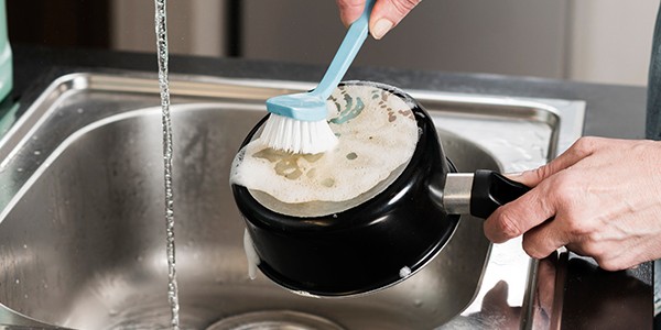 Karışımı uygulamak için yumuşak bir bez veya aşındırıcı olmayan bir sünger kullanıyoruz, ardından elde yıkayarak veya bulaşık makinesinde duruluyoruz.
