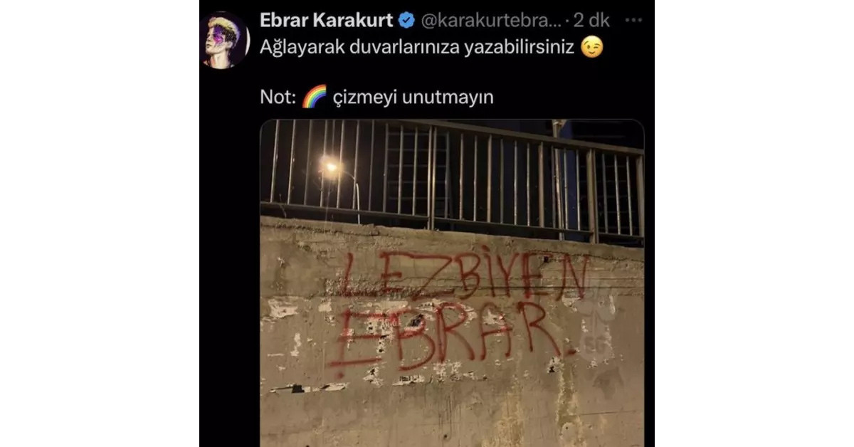 Son olarak X (Twitter) hesabından bir duvara yazılan "Lezbiyen Ebrar' yazısının fotoğrafını paylaşan milli sporcu, "Ağlayarak duvarlarınıza yazabilirsiniz" yorumunu yapıp bir de not ekledi: "Gökkuşağı çizmeyi unutmayın."