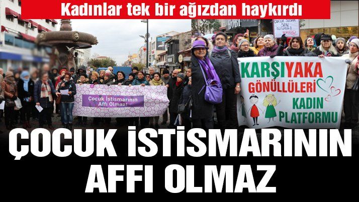 İzmir Kadın Platformu üyeleri, çocuk istismarcısına evlilik affına yönelik yasa tasarısı hazırlandığı iddialarına, düzenledikleri basın açıklamasıyla tepki gösterdi. Alsancak Kıbrıs Şehitleri Caddesi’nde toplanan 50 kadın, çocuk istismarı zanlılarına af tasarısı hazırlandığı iddialarına tepki amacıyla basın açıklaması yaptı.