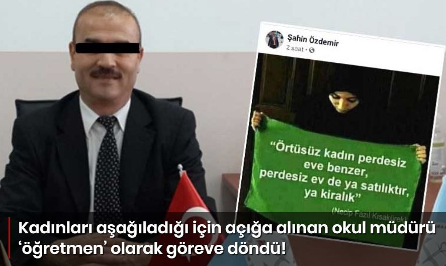 İzmir’in Karaburun İlçesinde ilköğretim okulu müdürü Şahin Özdemir, sosyal medya hesabında Necip Fazıl Kısakürek’e ait olduğu iddia edilen, “Örtüsüz kadın perdesiz eve benzer. Perdesiz ev ya satılıktır ya da kiralık” ifadelerinin yer aldığı paylaşım yapmıştı. Milli Eğitim Bakanlığı tarafından yapılan soruşturma sonrası, ‘kınama’cezası verildi ve okul yöneticisi görevinden alındı. Düz öğretmen olan Özdemir’in başka bir ilçe dışına öğretmen olarak atandığı belirlendi. CHP İzmir Milletvekili Murat Bakan, “Kirli düşüncelere sahip bir şahıs, ‘öğretmen’ sıfatıyla bir yerlerde çocuklarımıza ‘eğitim’ vermeye devam ediyor!” diyerek tepki gösterdi.