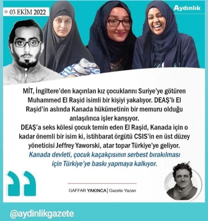 DEAŞ’a seks kölesi çocuk temin eden El Raşid, Kanada için o kadar önemli bir isim ki, istihbarat örgütü CSIS’in en üst düzey yöneticisi Jeffrey Yaworski, atar topar Türkiye’ye geliyor. Kanada devleti, çocuk kaçakçısının serbest bırakılması için Türkiye’ye baskı yapmaya kalkıyor. Türkiye, bu istediği reddediyor, El Raşid’i serbest bırakmıyor. Türkiye’deki bu tip gizli faaliyetleri bitirmeleri taahhüdü karşılığında Kanada’nın adını gizli tutuyor. Açıklamada Kanada zikredilmiyor, sadece “Suriye’deki ABD yanlısı koalisyonun üyesi olan bir ülke” deniyor.