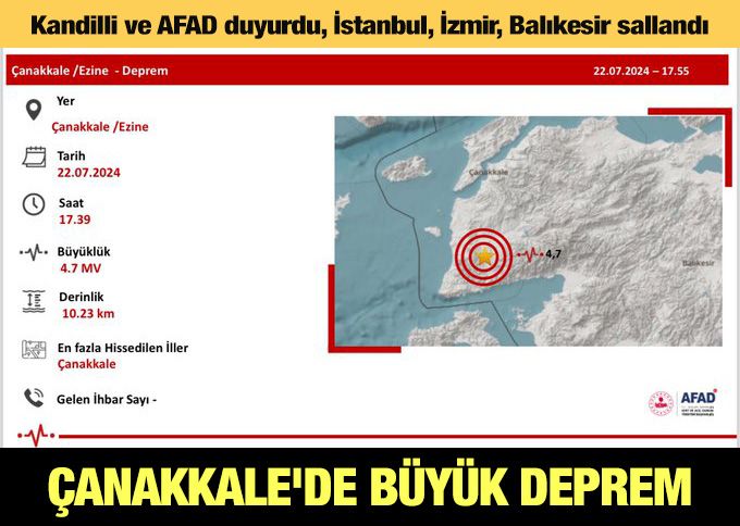 Kandilli Rasathanesi'nin verilerine göre Çanakkale'de saat 17.39'da 4.9 büyüklüğünde bir deprem meydana geldi. Merkez üssü Ezine olan şiddetli depremin derinliği 12.9 kilometre olarak kaydedildi.