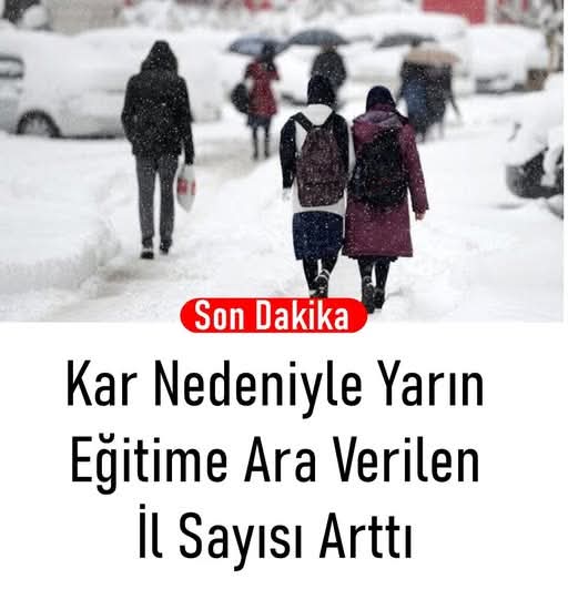 Kar nedeniyle yarın eğitime ara verilen iller YOR'UMDAİçişleri Bakanlığı, Meteoroloji Genel Müdürlüğü'nden alınan son değerlendirmelere göre başlayan ve halen devam eden bazı illerde kuvvetli ve yer yer yoğun kar yağışı beklendiğini duyurdu. Bakanlıktan yapılan uyarıya göre, bazı yerlerde kar kalınlığı 20 santimetreyi aşacak. Yarın eğitime bu nedenle ara verilen iller