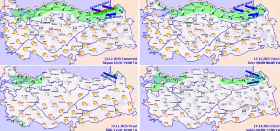 Meteoroloji Genel Müdürlüğü tarafından yapılan tahminlere göre: Ülkemizin kuzey, iç ve batı kesimlerinin yer yer çok bulutlu, Marmara’nın doğusu ve Karadeniz ile Muğla'nın güney, Antalya'nın batı çevrelerinin yağışlı, diğer yerlerin az bulutlu ve açık geçeceği tahmin ediliyor. Yağışların genellikle yağmur ve sağanak, Batı Karadeniz'in iç kesimlerinin yüksekleri ile Doğu Karadeniz’in iç kesimlerinde karla karışık yağmur ve kar şeklinde görülmesi bekleniyor. Yağışların Doğu Karadeniz kıyılarında yerel kuvvetli olacağı tahmin ediliyor. Gece ve sabah saatlerinde Marmara'nın güney ve doğusu ile iç ve doğu kesimlerde pus, yer yer sis görüleceği tahmin ediliyor.