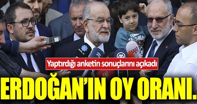 Son yaptırdığı anketin sonuçlarını açıklayan Saadet Partisi lideri Karamollaoğlu, 'Cumhur ittifakı'nın adayı Erdoğan'ın oy oranının yüzde 4244 bandında gözüktüğünü söyledi.