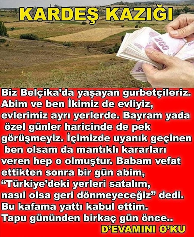 2 KARDEŞ KARDEŞ KAZIĞI Biz Belçika’da yaşayan gurbetçileriz. Abim ve ben İkimiz de evliyiz, evlerimiz ayrı yerlerde. Bayram yada özel günler haricinde de pek görüşmeyiz. İçimizde uyanık geçinen ben olsam da mantıklı kararları veren hep o olmuştur.