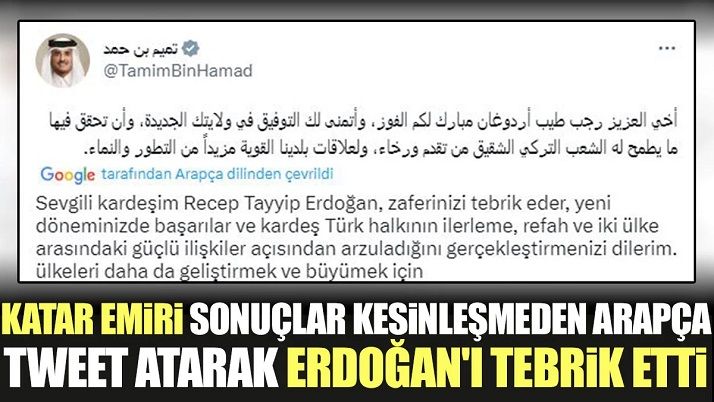 Twitter'dan paylaşım yapan Şeyh Temim, "Sevgili kardeşim Recep Tayyip Erdoğan, zaferinizi tebrik eder, yeni döneminizde başarılar ve kardeş Türk halkının ilerleme, refah ve iki ülke arasındaki güçlü ilişkileri gerçekleştirmenizi dilerim." notunu düştü.