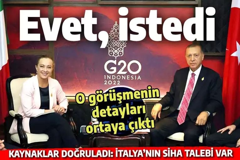 Görüşmelere tanıklık eden kaynağın verdiği bilgiye göre Cumhurbaşkanı Erdoğan'la Bali'de bir araya gelen İtalya Başbakanı Giorgia Meloni, ülkesinin Türk SİHA'larıyla ilgilendiğini ve SİHA satın almak istediklerini belirtti.