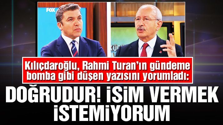* Siz bunu okuduğunuzda, ‘Doğrudur.’ dediniz mi?” sorusuna, “Evet.” karşılığını verirken, isim konusunda tahminde bulunmak istemediğini söyledi. Kılıçdaroğlu, “Her konuda konuşan Erdoğan, niye bu konuda konuşmuyor? Erdoğan desin ki ‘Yok efendim böyle bir şey. Ben kimseyle görüşmedim, kimseyi davet etmedim. Kimse de gelmedi ve kimseyle bu konuyu hiç konuşmadım.’ Diyemez mi? Diyebilir. Niye demiyor? Buradan Erdoğan’a açık ve net soruyorum: Bu haber doğru mudur, yanlış mıdır? Herkes konuşuyor, sadece susan Erdoğan. Erdoğan konuşmayabilir, ama bu konuda konuşacak yetkililer var, onlara talimat verir.”