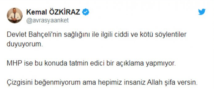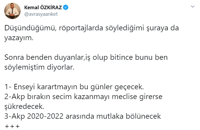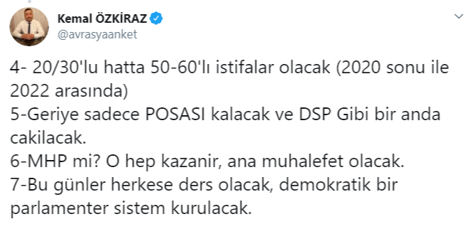 Yerel seçimleri yüzde 98’lik başarıyla tahmin eden, tekrarlanan İstanbul Büyükşehir Belediye seçimlerini ise tam isabetle bilen Avrasya Araştırma Şirketi’nden Şirket başkanı Kemal Özkiraz, Twitter hesabından bazı tahminlerde bulundu. Kemal Özkiraz'ın paylaşımları şöyle: