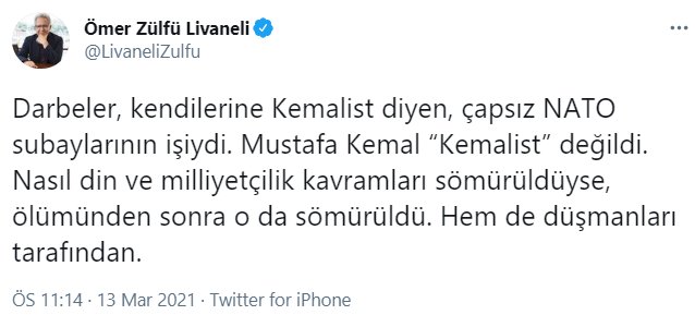 Zülfü Livaneli sosyal medyadan yaptığı bir paylaşımda şu cümleleri kullandı: "Darbeler, kendilerine Kemalist diyen, çapsız NATO subaylarının işiydi. Mustafa Kemal 'Kemalist' değildi. Nasıl din ve milliyetçilik kavramları sömürüldüyse, ölümünden sonra o da sömürüldü. Hem de düşmanları tarafından.”