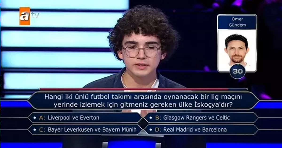 Kim Milyoner Olmak İster'in son bölümüne "Hangi iki ünlü futbol takımı arasında oynanacak bir lig maçını yerinde izlemek için gitmeniz gereken ülke İskoçya'dır?" sorusunda 2 joker kullanan Hilmi Can Söğüt damga vurdu.