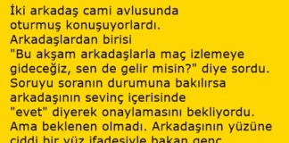 İki arkadaş cami avlusunda oturmuş konuşuyorlardı. Arkadaşlardan birisi “Bu akşam arkadaşlarla maç izlemeye gideceğiz, sen de gelir misin?” diye sordu. Soruyu soranın durumuna bakılırsa arkadaşının sevinç içerisinde “evet” diyerek onaylamasını bekliyordu. Ama beklenen olmadı. Arkadaşının yüzüne ciddi bir yüz ifadesiyle bakan genç, “Hayır maça gelemem. Biliyorsun ben evlendim, artık gözü yolda olan ve sürekli evde bekleyen bir eşim var. Bundan böyle hayatıma daha dikkat etmeliyim.” dedi.