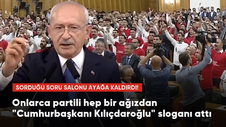 CHP lideri Kemal Kılıçdaroğlu'nun partisinin meclis grup toplantısında yaptığı konuşmada dikkat çekici bir gelişme yaşandı. Kılıçdaroğlu, orada bulunanlara: “Ya diktatörlüğü kalıcı hale getireceğiz ya da demokratik yollarla diktatörlüğü bitireceğiz. İkinci kez yanımda olmaya hazır mısın?” Sorusunu sorarken ayağa kalkan çok sayıda partili, “Cumhurbaşkanı Kılıçdaroğlu” sloganlarıyla salonu inletti.