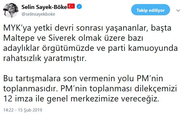 CHP içindeki “Sol Gelecek” grubundan İzmir Milletvekili Selin Sayek Böke, “MYK’ya yetki devri sonrası yaşananlar, başta Maltepe ve Siverek olmak üzere bazı adaylıklar örgütümüzde ve parti kamuoyunda rahatsızlık yaratmıştır. Bu tartışmalara son vermenin yolu PM’nin toplanmasıdır.