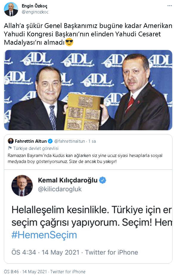 İletişim Başkanı Fahrettin Altun'un Cumhuriyet Halk Partisi (CHP) Genel Başkanı Kemal Kılıçdaroğlu'nun "Helalleşelim kesinlikle. Türkiye için erken seçim çağrısı yapıyorum. Seçim! Hemen! #HemenSeçim" paylaşımına; "Ramazan Bayramı’nda Kudüs kan ağlarken siz yine ucuz siyasi hesaplarla sosyal medyada boy gösteriyorsunuz. Size de ancak bu yakışır!" yanıtını veren Fahrettin Altun'a CHP Grup Başkanvekili Engin Özkoç'tan yanıt geldi.