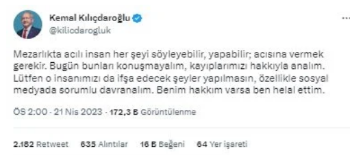 Mezarlıkta acılı insan her şeyi söyleyebilir, yapabilir; acısına vermek gerekir. Bugün bunları konuşmayalım, kayıplarımızı hakkıyla analım. Lütfen o insanımızı da ifşa edecek şeyler yapılmasın, özellikle sosyal medyada sorumlu davranalım. Benim hakkım varsa ben helal ettim.
