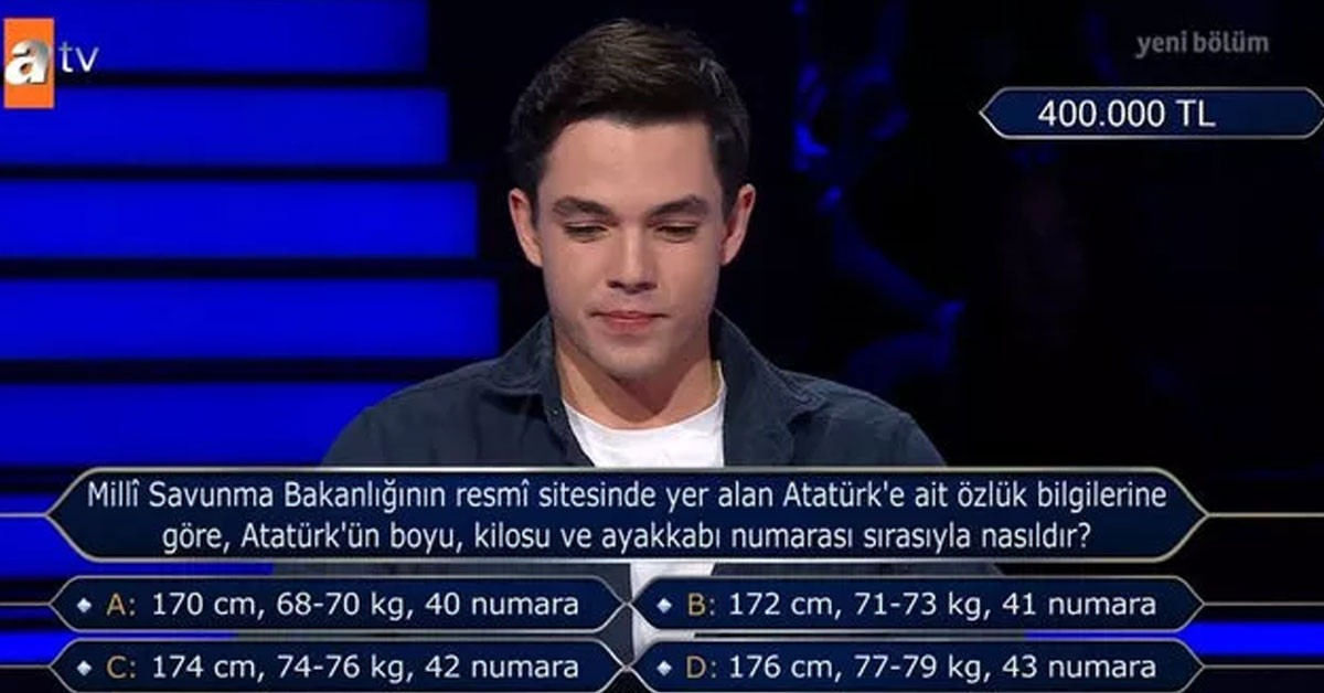 Milyoner yarışmasında Batu Alıcı'ya sorulan 400 bin TL değerindeki soru şu şekildeydi: 'Milli Savunma Bakanlığının resmi sitesinde yer alan Atatürk'e ait özlük bilgilerine göre Atatürk'ün boyu, kilosu ve ayakkabı numarası sırasıyla nasıldır?'