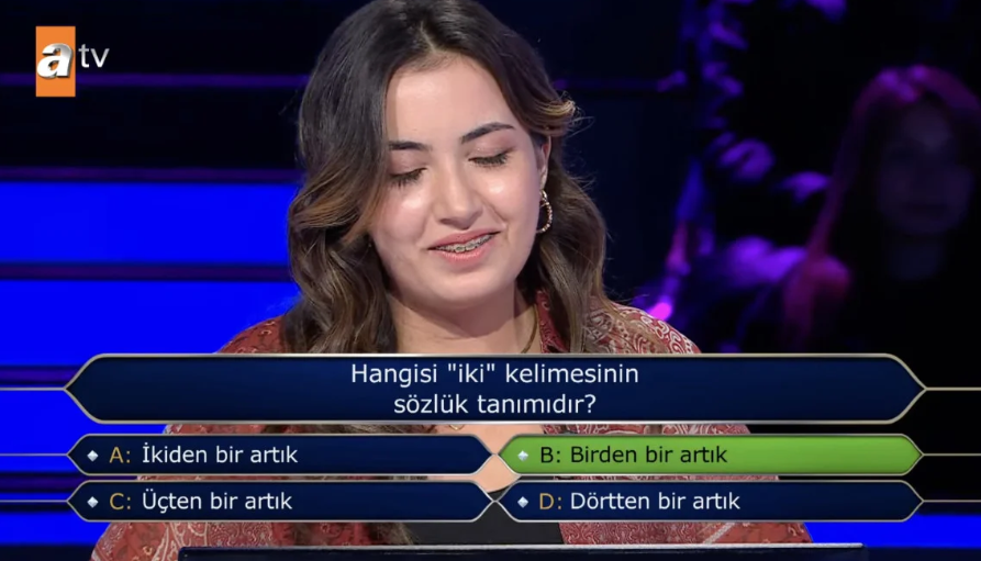 75. olan Galatasaray Üniversitesi Hukuk Fakültesi hazırlık bölümü öğrencisi Ayşe Naz Babalık'a,"Hangisi 'iki' kelimesinin sözlük tanımıdır?" sorusu soruldu.