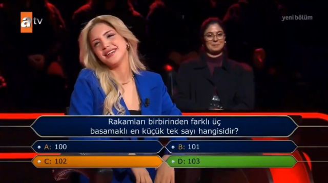 Sorulan soru, "Rakamları birbirinden farklı üç basamaklı en küçük tek sayı hangisidir?" şeklindeydi. Yarışmacı, soruya 102 yanıtını vererek elendi, ancak doğru cevap 103 olarak açıklandı. Bu durum, izleyicilerin dikkatinden kaçmadı.
