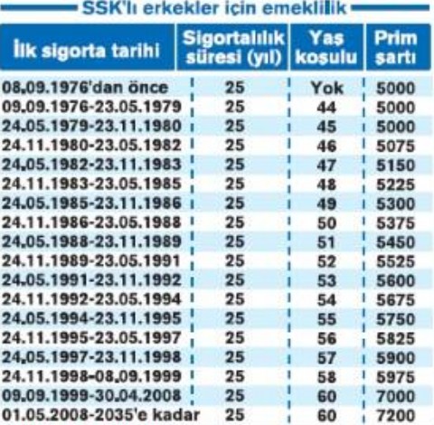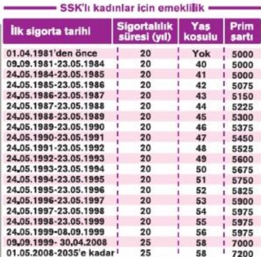 Sonrasında ise 1976 ile 1999 seneleri arasında işe girenlere kademeli yaş şartı uygulamasına geçilmişti. 30 Nisan 2008 tarihinden sonra işe girenler için emeklilik yaşı 65 olarak güncellenmişti. EYT çıkarsa erkek ve kadınlar için yukarıda yer alan tablo uygulanacak.