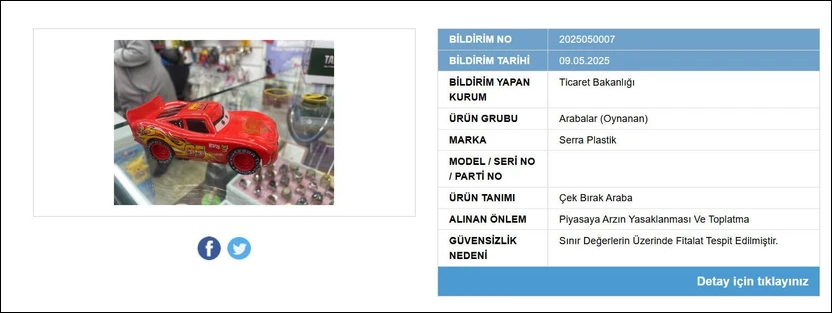 Satışı yasaklanan ve piyasadan toplatılmasına karar verilen diğer ürün ise "Serra Plastik" markasına ait oyuncak bir araba oldu. Üründe sınır değerlerin üzerinde fitalat tespit edildiği belirtildi. Kanserojen bir madde olan fitalatlar, kısırlığa neden oluyor.