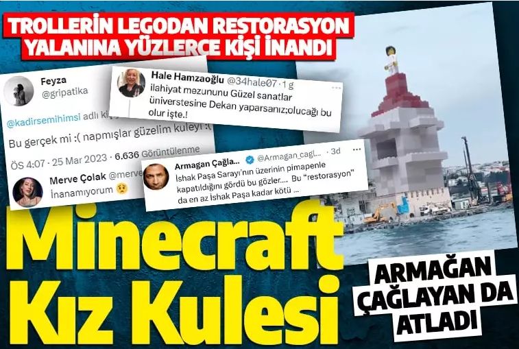 Kız Kulesi restorasyonu ile ilgili yeni bir yalan daha ortaya atıldı. Vapurla Kız Kulesi'nin yanından geçerken çektiği videoyu montajla değiştiren ve legodan inşa edilmiş gibi gösteren bir Twitter trollünün videosunu yüzlerce kişi gerçek zannederken yüzlerce troll de o görüntüleri yaymak için sıradan kullanıcılar gibi yorum yaptı.