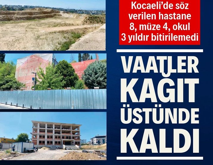 AKP iktidarının Kocaeli’deki “müjde”leri yine kağıt üzerinde kaldı. Çayırova, Darıca ve Gebze’deki kamu yatırımları yıllardır tamamlanamıyor. 5 defa ihalesi düzenlenen 8 senedir de yapılmayan bir hastane, 3 yıldır tamamlanamayan ilkokul ve 2021’den bu yana restorasyonu bitmek bilmeyen tarihi Osman Hamdi Bey müzesi var. Seçim dönemlerinde sıkça hatırlanan bu projeler, vatandaşların ihtiyaç duyduğu sağlık, eğitim ve kültür hizmetlerini karşılayamadı.