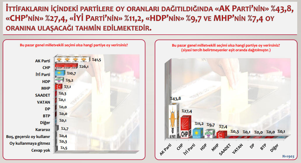 İttifak içindeki oy oranları ise şöyle tahmin edildi: “AKP yüzde 43,8, CHP 27,4, İYİ Parti yüzde 11,2, HDP yüzde 9,7 ve MHP yüzde 7,4."