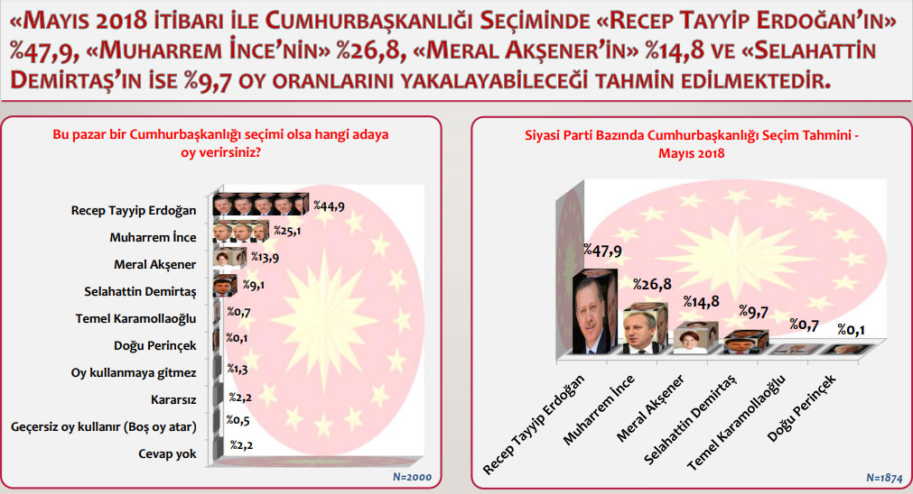 Cumhurbaşkanlığı seçimlerde ise Tayyip Erdoğan’ın yüzde 47,9, Muharrem İnce’nin yüzde 26,8, Meral Akşener’in yüzde 14,8, Selahattin Demirtaş’ın yüzde 9,7, Temel Karamollaoğlu’nun yüzde 0,7, Doğu Perinçek’in ise 0,1 oy alacağı öne sürüldü.