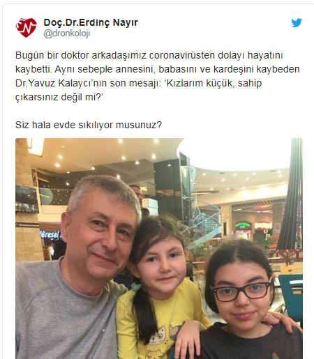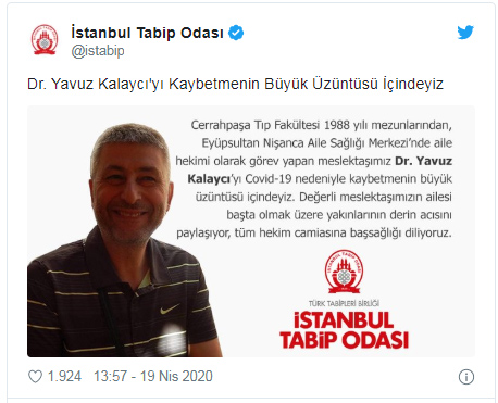 Eyüpsultan Nişanca Aile Sağlığı Merkezi hekimlerinden Yavuz Kalaycı Kovid19 nedeniyle hayatını kaybetti.