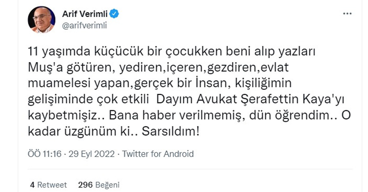 11 yaşımda küçücük bir çocukken beni alıp yazları Muş'a götüren, yediren,içeren,gezdiren,evlat muamelesi yapan,gerçek bir İnsan, kişiliğimin gelişiminde çok etkili Dayım Avukat Şerafettin Kaya'yı kaybetmişiz.. Bana haber verilmemiş, dün öğrendim.. O kadar üzgünüm ki.. Sarsıldım!Uzun süre Müge Anlı ile Tatlı Sert programında yer alan ve ani bir şekilde programdan ayrılan Prof. Dr. Arif Verimli'den üzen haber geldi. Sosyal medya hesabından yaptığı "11 yaşımda küçücük bir çocukken beni alıp yazları Muş'a götüren, yediren,içeren,gezdiren,evlat muamelesi yapan,gerçek bir İnsan, kişiliğimin gelişiminde çok etkili Dayım Avukat Şerafettin Kaya'yı kaybetmişiz.. Bana haber verilmemiş, dün öğrendim.. O kadar üzgünüm ki.. Sarsıldım!" paylaşımıyla dayısının vefatını duyurdu. Bunu duyan Müge Anlı'nın ise çok üzüldüğü söyleniyor.Ayrıca Verimli de kendisine haber verilmemesinden sitem ederek "Bana hangi düşünceyle haber edilmediğini hala anlamlandıramıyorum. İçim acıyor içim.." dedi.