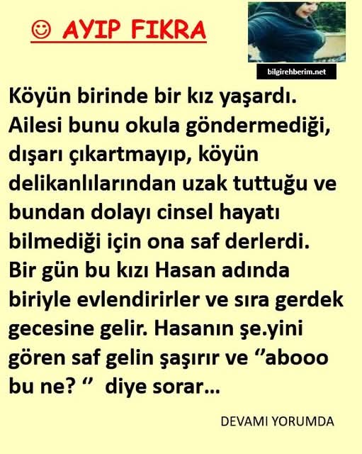 Bir gün bu kızı hasan adında biriyle evlendirirler ve sıra gerdek gecesine gelir. Hasanın şe.yini gören saf gelin şaşırır ve bu ne diye sorar. Devamını bir diğer sayfamıza geçerek okuyun.......