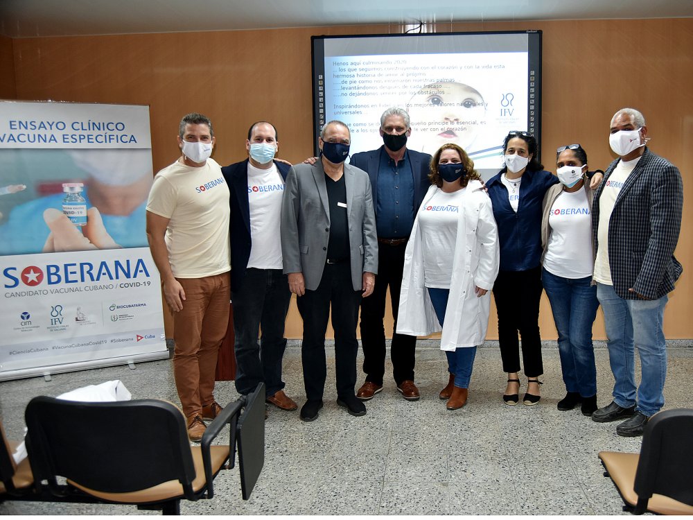 Ülkesindeki aşı çalışmalarını yakından izleyen Küba Devlet Başkanı Miguel DíazCanel Bermúdez, sık sık Finlay Devlet Aşı Laboratuvarları'nı ziyaret edip Prof. Dr. Vicente Guillermo Verez Bencomo ve Prof. Dr. Dagmar Garcia başkanlığındaki heyetten gelişmeler hakkında bilgi alıyor.
