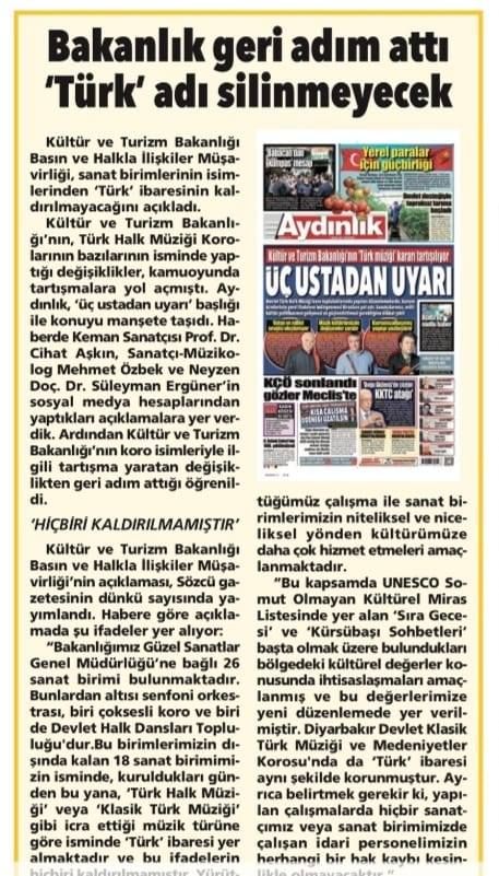 Kültür ve Turizm Bakanlığı'nın "olur" verdiği önergeyle Elazığ'daki Klasik Türk Müziği Korosu Müdürlüğü "Elazığ Kürsübaşı Müzik Topluluğu Müdürlüğü", Şanlıurfa'daki Devlet Türk Halk Müziği Korosu "Şanlıurfa Sıra Gecesi Müzik Topluluğu", Diyarbakır'daki Devlet Klasik Türk Müziği Korosu "Diyarbakır Medeniyetler Müziği Korosu", Edirne'deki Devlet Türk Müziği Topluluğu "Edirne Rumeli Müzikleri Topluluğu" olarak değiştirildiğini açıklamıştı. Bakanlığın müzik korolarındaki "Türk" isminin kaldırıldığına dair açıklaması sonrasında gelen tepkilerin ardından yeni bir açıklama yaparak müzik korolarından Türk ibaresinin kaldırılmadığını açıkladı.