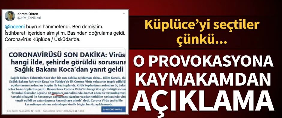 Twitter'da 'Afet_Tehlikesi' kullanıcı adı, 'Kerem Ökten' ismiyle paylaşımda bulunan bir kişi, Üsküdar'ın Küplüce Mahallesi'nde koronavirüs vakasına rastlandığını belirten bir haber sitesine ait görseli 'istihbaratı içeriden almıştım' diyerek paylaştı. Söz konusu görselde yer alan hastanın karantinaya alındığı bilgisi Üsküdar Kaymakamı Mustafa Sefa Demiryürek tarafından yalanlandı.