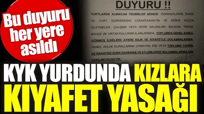 “Yurtlarda alınacak tedbirler gereği, öğrencilerin idare ve yurt içerisindeki lokanta/kantin ve diğer küçük işletmeler, çalışma veya spor salonları, balkon, teras, bahçe vb. ortak kullanım alanlarında, toplumda genel kabul görmüş ilkelere aykırı kılık ve kıyafetle dolaşmalarına genel ahlak kurallarına uymayan, kişi veya toplumu tahrik ve rahatsız eden davranış ve eylemlerde bulunmalarına izin verilmeyecektir.”