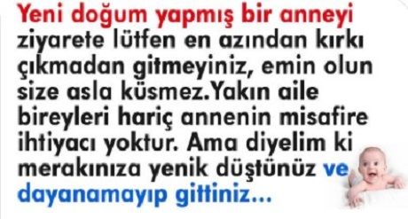 Yeni doğum yapmış bir anneyi ziyarete lütfen en azından kırkı çıkmadan gitmeyiniz, emin olun size asla küsmez.