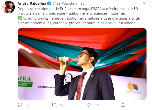 Rajoelina, Madagaskar Uygulamalı Araştırma Enstitüsü'nün geliştirdiği ve sıtma tedavisinde kullanılmasıyla bilinen artemisia bitkisi ve ülkedeki birçok "şifalı otun" karışımından oluşan "Covid Organics" adını verdikleri ilacın tanıtımını yaptı. Bitkisel çayın yedi gün içinde sonuç verdiğini belirten Rajolina, "Bugün bu ilacın iyileştirdiğini, ve öldürmediğini göstermek için önünüzde deneyeceğim" diyerek ilacı içti.
